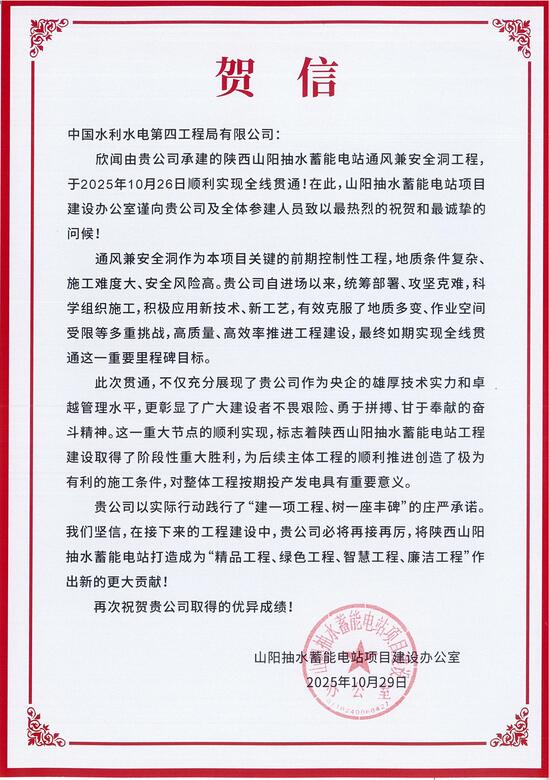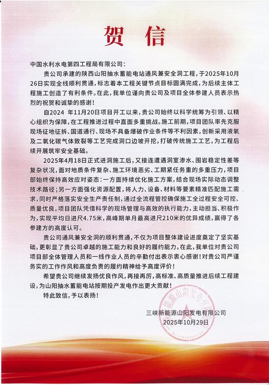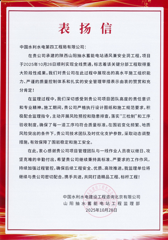 近日,山阳抽蓄项目部接连收到来自陕西山阳抽水蓄能电站建设管理处、三峡新能源山阳发电有限公司、中国水利水电建设工程咨询北京有限公司山阳抽水蓄能电站工程监理部等单位的表扬信、贺信,对项目部承建的陕西山阳抽水蓄能电站通风兼安全洞于2025年10月26日顺利实现全线贯通表示赞扬和祝贺。 信中对公司在高水平施工组织能力、严谨的质量控制体系和扎实的安全管理方面的举措表示由衷的赞赏和充分肯定,对全体参建人员表示诚挚的感谢。 业主贺信中指出,在工程推进过程中项目部直面多重挑战,接连遭遇洞室渗水、围岩稳定性差等复杂状况,面对地质条件复杂、施工环境恶劣、工期紧任务重的多重压力,项目部始终保持高效应对姿态。项目团队凭借科学的现场管理与高效的执行能力,主动担当、积极作为,实现平均日进尺4.75米,高峰期单月最高进尺210米的优异成绩,赢得了各参建方的高度认可。监理表扬信指出,在施工过程中,项目部严格执行设计图纸和施工规范要求,积极配合监理指令,主动开展风险预控和隐患排查,落实“三检制”和工序验收制度,确保了每一道工序均符合质量标准。政府贺信中赞扬此次通风兼安全洞全线贯通充分展现了公司作为央企的雄厚技术实力和卓越管理水平,更彰显了全体建设者不畏艰险、勇于拼搏、甘于奉献的奋斗精神。 荣誉的背后,是无数个日夜的坚守与付出。接下来,山阳抽蓄项目部将继续紧盯施工履约,狠抓质量安全,持续总结经验、固化成果,圆满完成后续工程建设任务。 |