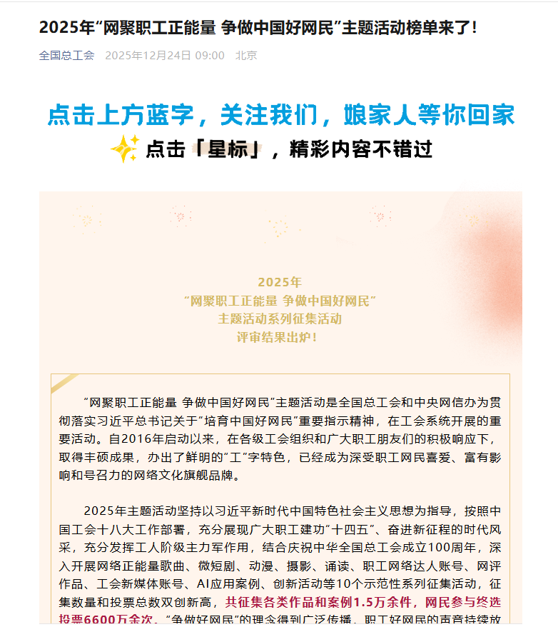近日,由中华全国总工会与中央网信办联合主办的2025年“网聚职工正能量 争做中国好网民”主题活动评选结果正式公布,投资公司工会推荐的员工网评文章《山河间的匠心群像:水电四局人用坚守点亮能源梦想》在激烈竞争中脱颖而出,荣获优秀评论奖项。 此次主题活动规模宏大、影响深远,吸引了来自全国各地的众多优秀作品参与角逐。李亮蓉创作的这篇网评文章,将目光聚焦于四局人这一平凡而伟大的群体。作者以细腻且生动的笔触,勾勒出他们在广袤山河间默默坚守的身影,讲述着他们凭借匠心与汗水,为点亮能源梦想而不懈奋斗的动人故事。文章中,四局人面对艰苦工作环境时的坚韧不拔,对技术精益求精的执着追求,以及对国家能源事业的无限忠诚,都被刻画得入木三分,让读者深切感受到新时代产业工人爱岗敬业、无私奉献的高尚精神品质,如同一束温暖而明亮的光,传递出积极向上的强大正能量。 这一殊荣的获得,不仅是对投资公司员工个人才华与辛勤付出的高度肯定,更是投资公司长期以来重视职工文化建设、积极鼓励员工传播正能量所结出的丰硕成果。一直以来,投资公司致力于营造积极健康的企业文化氛围,为员工提供广阔的创作平台和丰富的成长机会,激发员工的创造力和表达欲,让每一位员工都能在工作中找到价值感与归属感。 投资公司将以此获奖为新的起点,持续鼓励员工立足自身岗位,深入挖掘工作中的闪光点,创作出更多兼具深度、温度与力量的优秀作品。通过这些作品,进一步展现投资公司员工的风采,传播正能量,为营造健康清朗、积极向上的网络空间贡献投资公司的智慧与力量,在推动社会精神文明建设的征程中书写更加精彩的篇章。 获奖结果公布网址:https://mp.weixin.qq.com/s/eU1boLjrnCt9CuVP61CmeA |